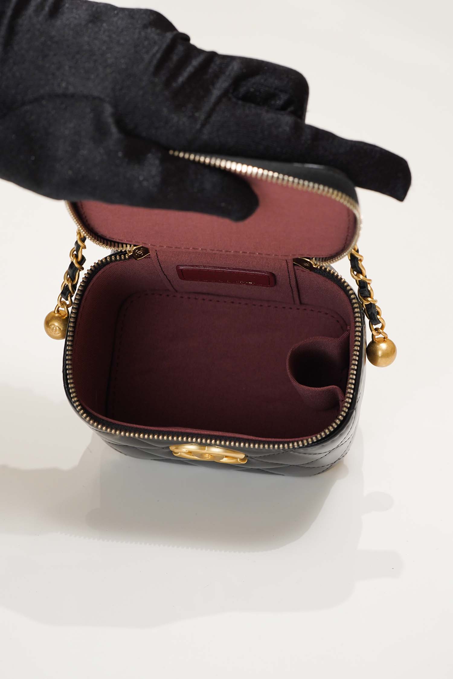 - Không Gian Lý Tưởng: Mặc dù thiết kế nhỏ nhắn nhưng Chanel Vanity mang lại không gian chứa đồ vô cùng tiện lợi, phù hợp để bạn đựng các vật dụng cần thiết hàng ngày.