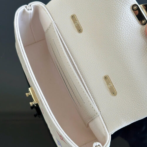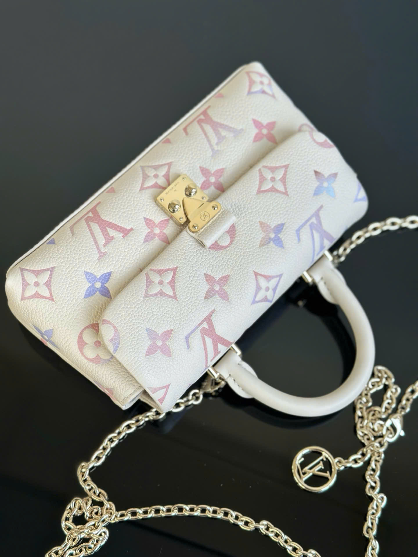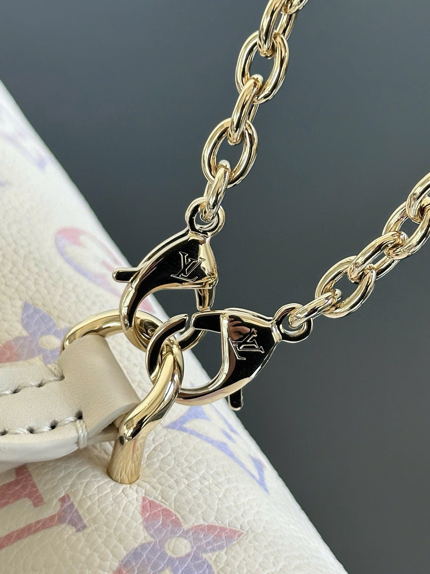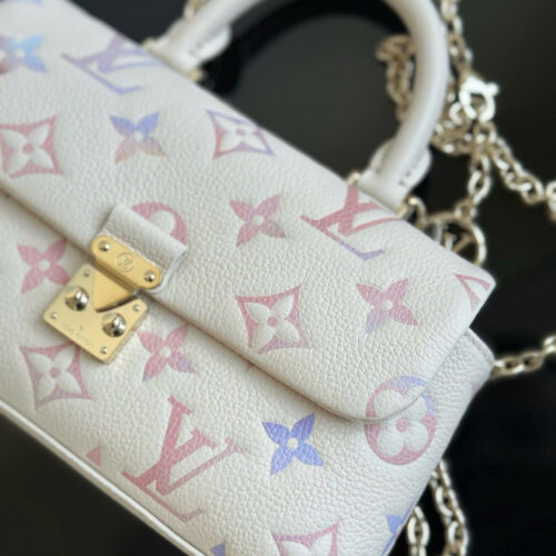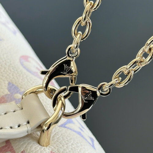 Phần logo LV kim loại nổi bật phía trước tạo điểm nhấn sang trọng, kết hợp cùng dây xích ánh vàng giúp tổng thể thêm phần đẳng cấp và cuốn hút.