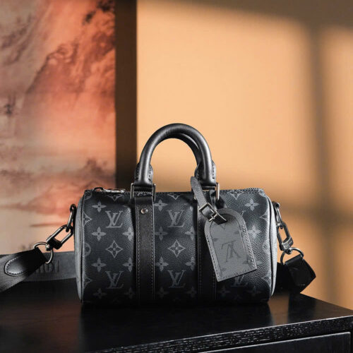 LV KEEPALL BANDOULIERE – 25 – GRAY – MONOGRAM ECLIPSE – SILVER